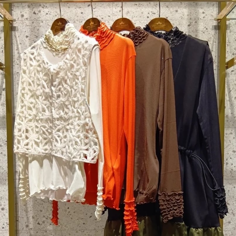 ジレやニット、ジャケットのインナーとしてコーディネートを華やかにしてくれるアイテムです。